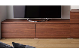 TVボードでは、壁施工無しでテレビをフロート設置できる薄型バックパネルをご用意。AV機器収納部は同色仕上げのガラス扉で仕上げており、扉を閉めたままでもリモコン操作が可能です。