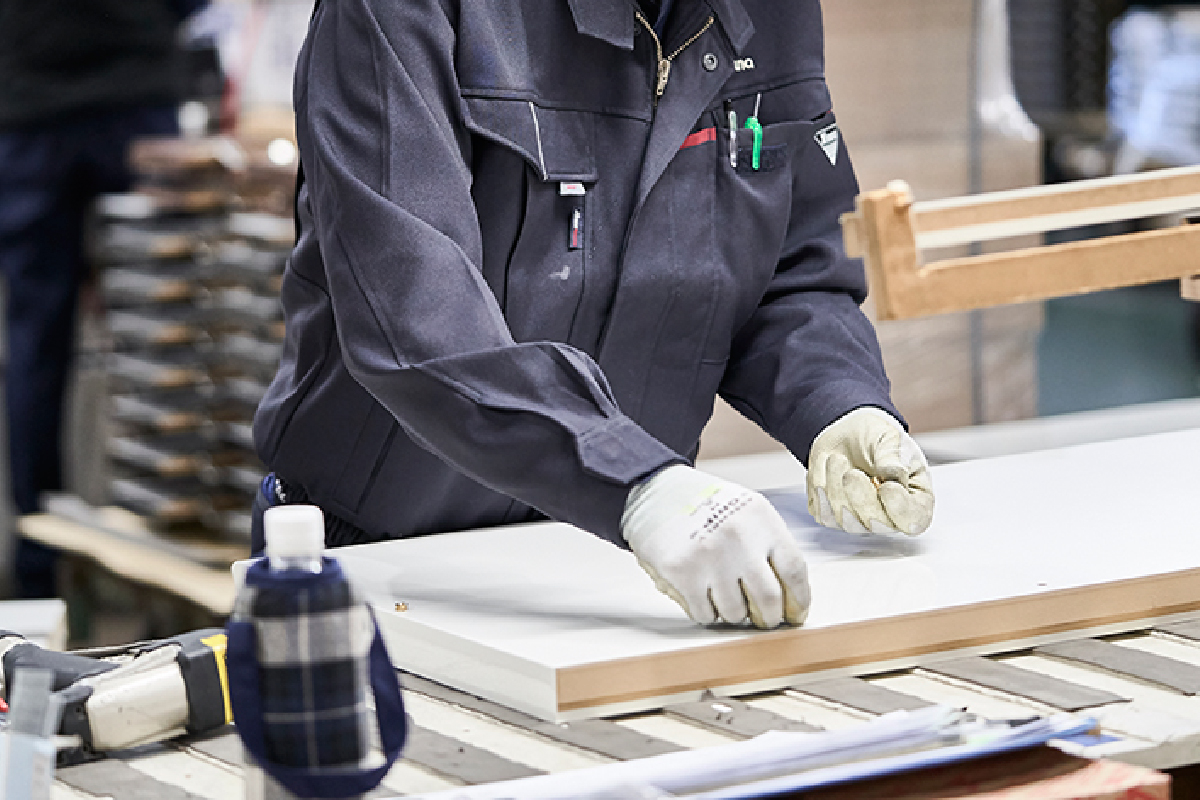 量産化により精度の高い商品のコストを抑えながら作製することができる一方、様々なセミオーダーにお応えできるシステムがあるのがパモウナの強み。
