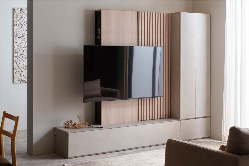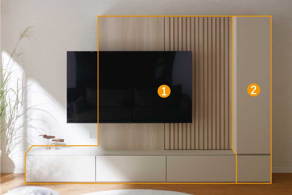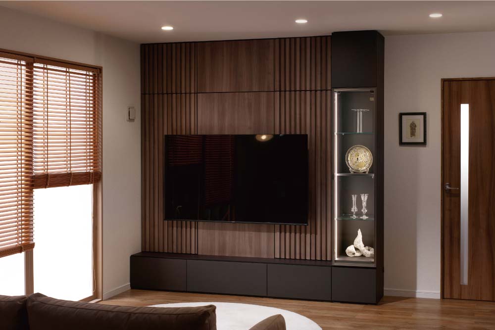一見するとフラットに見える壁面のデザイン。その裏側には、AV 機器や小物類などをすっきり収められる隠し収納を仕込んでいます。