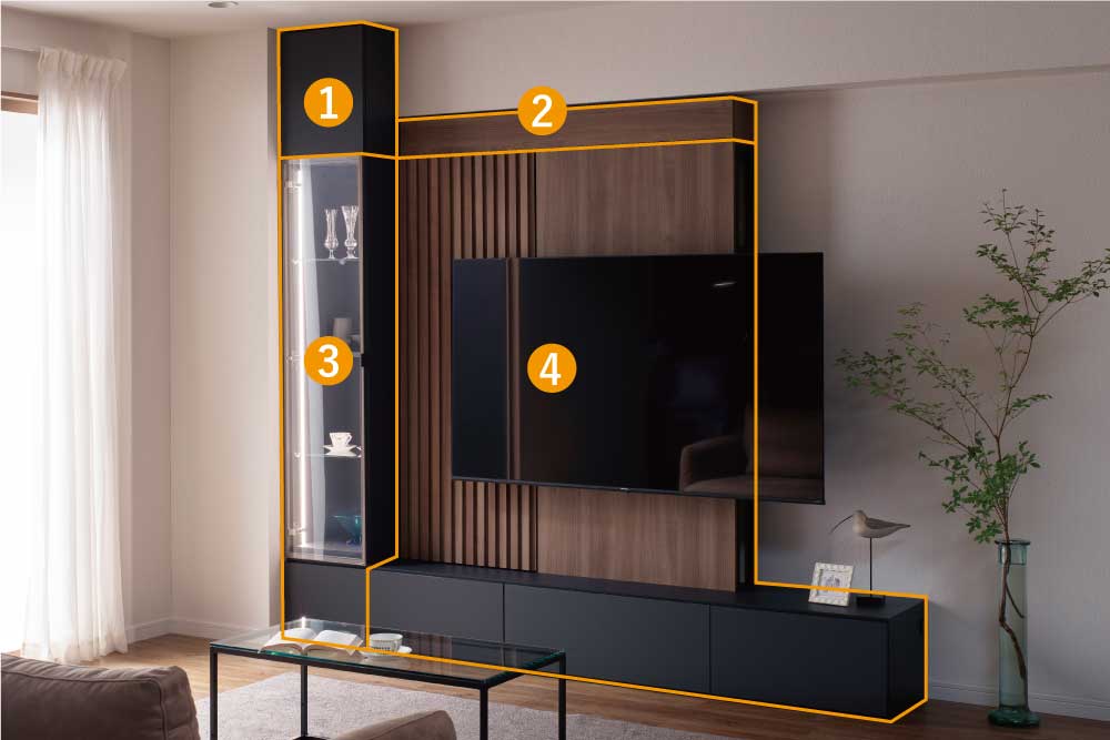 テレビボードの他にもキャビネットやサイドドアフィラーを追加することで、空間に合わせたサイズにできます。