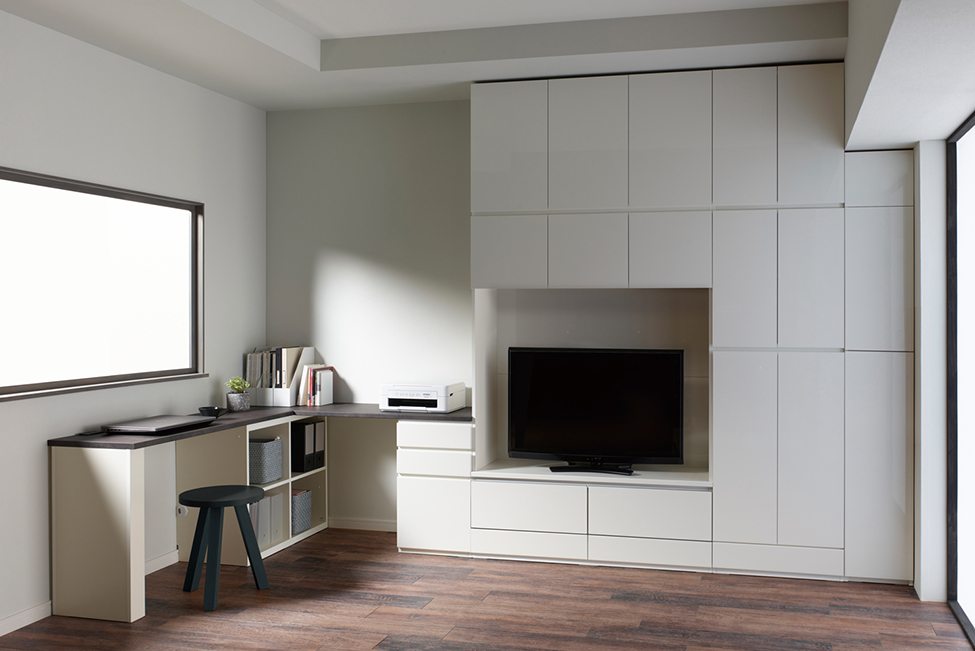 デスク、キャビネット、TVボードを組み合わせることで、様々なレイアウトを可能とした豊富なアイテムバリエーション。幅オーダーアイテムを組み合わせれば、間口いっぱいに隙間なく美しく収めることができます。